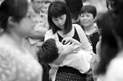杭州萧山区闻堰镇中心幼儿园门前,一位母亲抱着孩子,排队报名。 董旭明/视觉中国