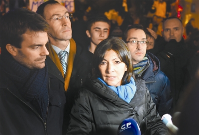 1月10日晚,巴黎市长伊达尔戈(前)与法国民众聚集在巴黎共和国广场,追思2015年法国多起恐怖袭击的罹难者。