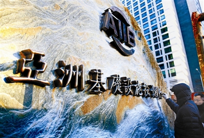 1月12日,北京,金融街附近的亚洲基础设施投资银行(亚投行)大厦装扮一新,工人挂牌迎开业。开业仪式系列活动于1月16日至18日在北京举行。亚投行由中国倡导设立,是政府间性质的亚洲区域多边开发机构,重点支持基础设施建设。