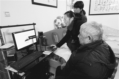 1月13日,安徽合肥,在蜀山区荷叶地街道退休老人范家保家中,街道社会事务科工作人员正在指导老人利用家中电脑进行退休人员身份认证。
