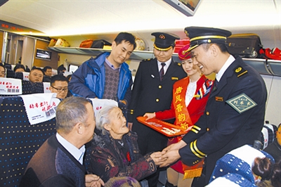 刘东升担任太原南开往沈阳北的G2602次列车的列车长五年来,不断探索服务新方法,主打亲情服务新特色,让旅客感受到“服务与速度同步、品质与需求同行”的“晋之星”客运服务品牌的内涵。图为列车长刘东升为首次乘座高铁的88岁的周大娘送上精美的乘车纪念品。