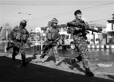 1月13日,在阿富汗东部楠格哈尔省省会贾拉拉巴德,安全人员跑向发生爆炸的地点。