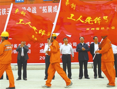 贵州人大常委会副主任、省总工会主席袁周(左三)与省总工会党组书记、副主席杨兴举(左四)共同出席贵州高铁3年建设会战誓师大会