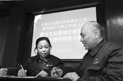 1月16日,已经当了20年职工代表的石家庄高新区供水排水公司工程公司管道工安文斌(右),在公司第四届职代会第10次会议上对公司领导投信任票。他高兴地说:“我已连续10次对企业领导进行评议监督,他们用共产主义理想和社会主义核心价值观教育职工,身体力行以身作则,我们信得过。”