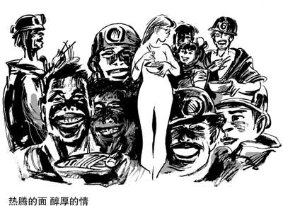 我在煤矿蹲点,常常会跟亲爱的工人师傅们一起吃一碗鸡蛋面,看着他们工作服上的煤尘与油灰,看着他们买饭时的选择与犹豫,看着他们大口吃面大口吞饼的模样。我喜欢他们吃饭的样子:衣衫不整的,赤了膊光着脊背,大嚼出声的,喝汤淌汁的,吃着说着抬杠侃大山……豪爽、坦诚,他们的恣意,那般自然流淌。