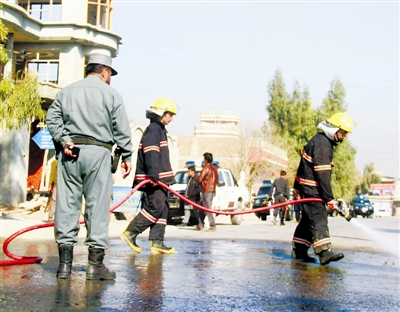 1月17日,在阿富汗楠格哈尔省首府贾拉拉巴德市,消防人员清理爆炸现场。