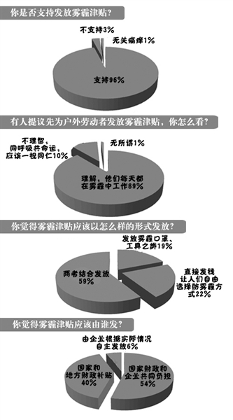 对于“‘雾霾津贴’怎么发”的问题,超过一半的受访者力挺应采用防霾工具和现金发放相结合的形式;22%的受访者认为直接发钱最简单,也可自主选择防霾方式;19%的受访者则认为,“雾霾津贴”应以单纯的防霾口罩等实物发放。“雾霾对于人体的伤害是直接的,不能流于形式。”微信名为“@静如芷水”的受访职工选择以现金和实物结合的形式发放“雾霾津贴”,他认为,单纯发放现金只是对身体损伤后简单的“健康补贴”,而发放实物则可以让这份特殊津贴落到实处,尽可能减少雾霾对人体的伤害。