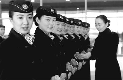 1月19日,郑州客运段的乘务员在练习服务时的规范动作。