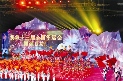 开幕式表演以“冰雪天山、阳光丝路”为主题,演绎了“冰雪缘”、“天山情”、“中国梦”3个篇章,展现了充满生机活力的大美新疆。本届冬运会历时11天,全国52个代表团的1388名运动员参加各项比赛,总共将产生97枚金牌。本报记者 许之丰 摄