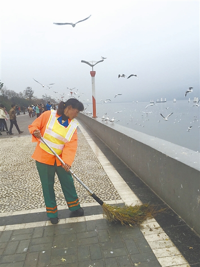 2015年12月31日早晨8时,《工人日报》记者在海埂观景大坝找到了杨艳华,数九寒冬,她正拿着大扫帚清扫负责的区域,然后再换小扫帚清理角落里的垃圾。