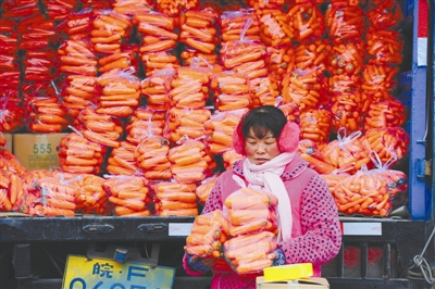 1月21日,在安徽省阜阳市瑶海农产品批发市场,蔬菜供应商从外地运来满车新鲜胡萝卜供应市场。