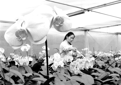 经技术专家近两年的精心培育,首批100多株太空蝴蝶兰近日在江苏连云港绽放。2013年6月,连云港振兴花卉有限公司选送两枚蝴蝶兰果荚,乘神舟十号飞船一起进入太空。蝴蝶兰果荚经长达半个月的太空失重和宇宙射线辐射,返回地面后被送入无菌接种室进行培育,从第一个果荚中梳理出来的蝴蝶兰籽种,总共培育出3000多株太空蝴蝶兰。这批太空蝴蝶兰品种开花时间较普通品种早6个月,花苞增加了三四个,花径也长出一厘米。图为工作人员在精心护理太空蝴蝶兰。耿玉和 摄