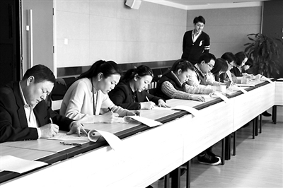 1月15日,中铁置业西安公司及所属4个项目的营销和客服人员在参加闭卷考试。这次考试与以往不同,试题由营销和客户专业人员互相出题, 考试成绩计入员工晋升和绩效考核,拼的是真功夫。彭华 摄