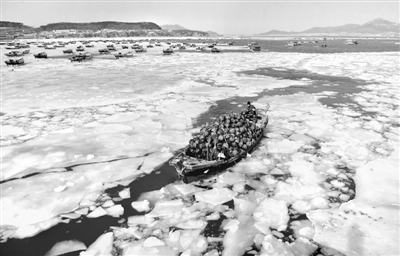1月21日,辽宁大连,海上养殖户在金州新区金石滩抢运海产品及海上物资。冰面扩大,多艘渔船被“钉”在冰面上。受连日降温降雪天气影响,黄海和渤海海冰面积迅猛扩大,其中渤海海冰面积已扩展至18469平方公里。随着寒流的增强,预计未来几天黄海及渤海北部冰情将维持扩大,提醒有关海上作业、水产养殖及交通运输部门要提前部署防范措施,减少海冰造成的灾害损失。 吕铁城 摄/视觉中国