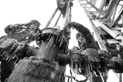 图为1月20日,冀东油田井下作业公司试油六队员工正冒着严寒在南堡32-3042井进行下笔尖管柱施工。杨军 摄