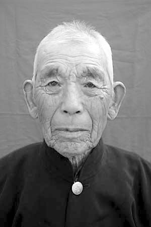 红色背景布上,他干瘦如柴、双唇紧抿,眼窝在满脸褶皱中深陷,头发稀疏而发白。