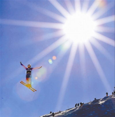 第十三届全国冬季运动会自由式滑雪空中技巧比赛日前在新疆天山天池滑雪场进行。图为运动员空中英姿。本报记者 许之丰 摄