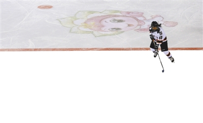 上海冰球队队员李秋雨在对阵香港队的比赛中进攻。