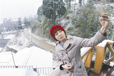 1月24日,在越南北部老街省沙巴镇,一名女子与雪景合影。