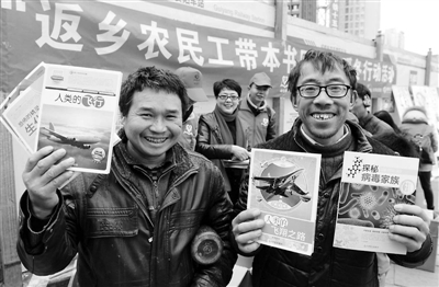1月24日,贵阳市,两名返乡农民工在展示其刚刚获赠的图书。为丰富返乡农民工春节期间的文化生活,贵州省励志捐书助学中心和贵阳火车站等单位在贵阳火车站联合开展“返乡农民工带本书回家”暖冬行动。