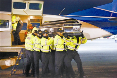 1月24日,在哥斯达黎加阿拉胡埃拉的机场,安全人员抬着装有尼加拉瓜沉船事件遇难者遗体的棺椁。尼加拉瓜军方23日证实,该国加勒比海域一个旅游景区当天下午发生游船倾覆事故,造成13人死亡。船上载有的32人中大部分是来自美国和哥斯达黎加的游客。目前,军方在事故现场发现了13名哥斯达黎加籍遇难者遗体,其中包括8名女性,其他游客均已获救。