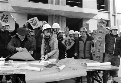 1月27日,陕建八建集团组织该集团职工书法家来到西安西郊,在庆安项目部工地开展“吉祥春联带回家,高高兴兴过新年”活动,为200名农民工现场送春联。职工书法家不畏严寒,现场书写春联,受到农民工欢迎。