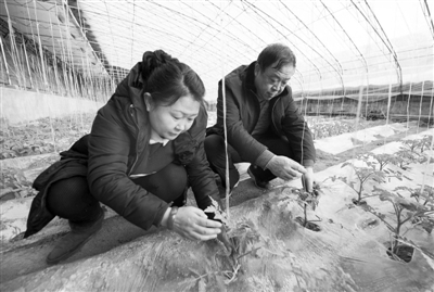 图为临河区农业局科技人员(右)向八一乡联丰村农民传授西红柿种植技术。