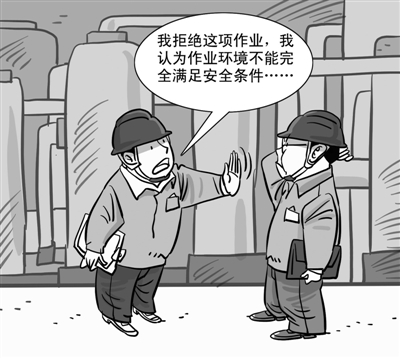 “郑工,我拒绝这项作业。里面的热水如果溅出来我没处躲呀,容易被烫到,我希望可以整改一下再做。”外操符权对设备员郑义吉说。
