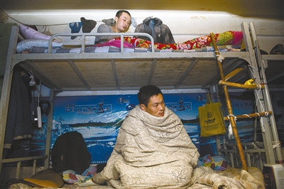 没有暖气的出租屋里,张文富裹着被子与上铺工友聊天。