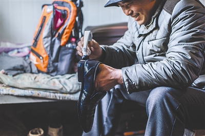 1月23日,陈长兴在活动板房内擦鞋准备返乡。当日,他和工友们一同乘大巴车回家过年。