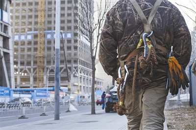 下工后,在高楼林立的东三环附近,这样的工人随处可见。
