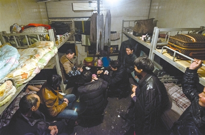 张文富所在的施工队负责搭建工地上的脚手架,他们来自四川,在四惠附近租住了两间不足20平方米的平房,8个人租一间,月租金1200元。每天早上6点,他们需要骑车半个小时到3公里之外的工地上。