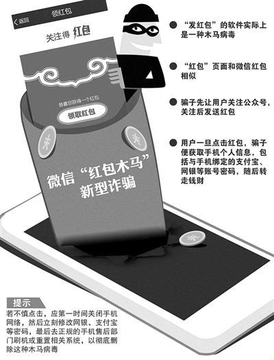 据《江西日报》报道,南昌的王女士在微信上接到朋友发来的“抢红包”链接,链接上写明是500元代金券,只要王女士输入身份证号等基本信息,再扫描一下二维码就能得到“红包”。王女士填写信息没多久,手机就收到一条信息,称她的信用卡消费了1万多元。原来她打开的并非红包,而是一个木马病毒。