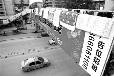 1月26日,安徽安庆,市民纷纷将衣物拿到户外进行晾晒。闹市区的几座天桥也被市民挂满棉被,过往车辆在棉被下穿行,不仅影响市容,也带来交通安全隐患。