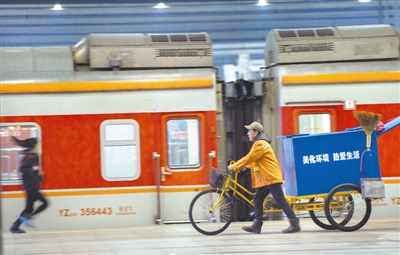①北京西站,环卫工人一早就赶到站台清理垃圾。 本报记者 吴凡 摄