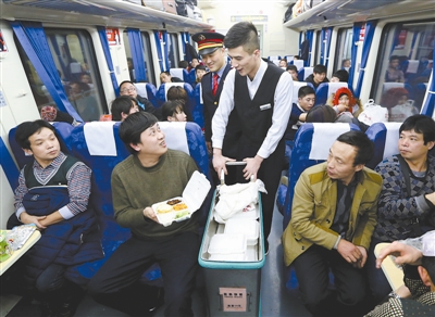 1月31日,列车员在上海客运段承担营运的Z164次列车上为旅客提供15元盒饭。