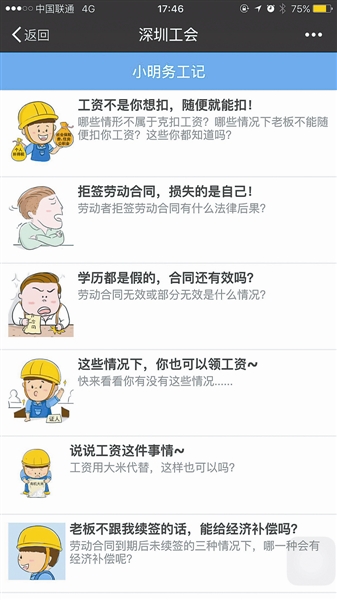 “签订劳动合同,你必须知道的5个注意事项”、“在深职工如何办理工伤认定”、“集体合同怎么签”……在“深圳工会”,不论是“小明务工记”,还是“静静有问题”等栏目,都紧扣职工权益维护主题。而“圆梦计划”、“职工医疗互助保障”等内容和栏目都紧紧围绕职工生产生活需求。