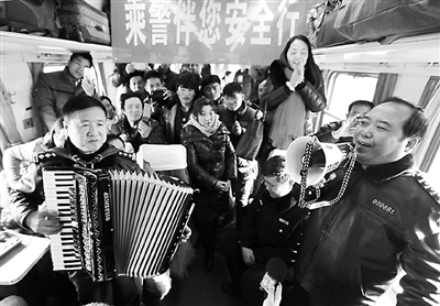 动人的歌曲,优美的舞姿,风趣的快板,幽默的小品……太原铁路公安处组织文艺小分队在春运期间将活跃在30对旅客列车上,用自编自导的文艺节目,宣传旅行安全常识。康哲 摄