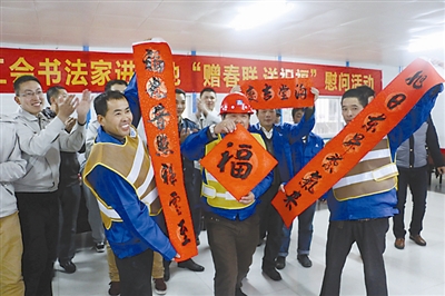 本报讯(记者李元浩 通讯员张卓)时近新春佳节,中建二局深圳湾科技生态园项目生活区人头攒动,暖意浓浓。由深圳市总工会主办,深圳市大爱文化艺术研究院、深圳书画家协会和中建二局深圳分公司工会联合承办的书法家“赠春联 送祝福”活动在这里举行。5位深圳知名书法家现场为200多名农民工送出对联300多副,“福”字600多个,给项目建设者带来佳节的吉祥喜庆。