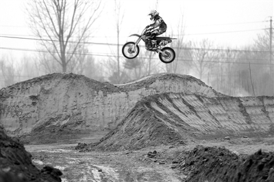 1月27日,河南省郑州市古荥镇一片荒野上,数名越野摩托骑手在一块赛车场地中玩飞车,相互追逐着。用于越野飞车的场地是一块约50亩、合3万多平方米的荒地,场地内的赛道高低起伏,壕沟加回转等颇有些国际赛道的范儿。