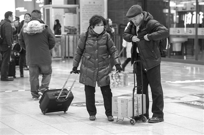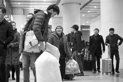 1月27日北京南站到达口,孙子接过奶奶从老家带的大包行李,奶奶怜爱地望着孙子。