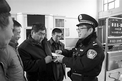 临近年关,平遥车站派出所民警热心为外出务工的农民工旅客识别真伪火车票,防止上当受骗,安全乘车回家。(张欣炜)