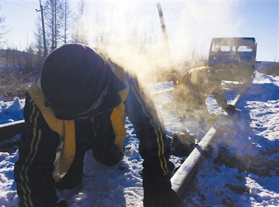 1月18日上午9时半,阿龙山线路车间金林养护工区作业现场,养路工人史作林、刘峰正在给钢轨与路基枕木间隙处垫橡胶片。此时,户外温度是零下36摄氏度。本报记者 黄康 摄