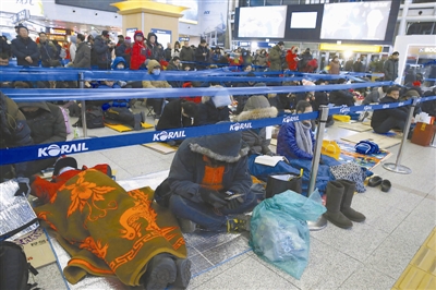 根据韩国法律规定,2016年韩国春节假期连周末共休4天。今年,韩国铁路部门从1月19日起开售春节假期火车票。很多市民18日晚就聚集到首尔火车站,冒着零下10多摄氏度的严寒通宵排队等候买票。网上售票从19日6时开始预售,情况也同样火爆,到9时20分大部分车票已被抢购一空。买票难使很多韩国网友戏称每年这个时候是“归省票预订战”。