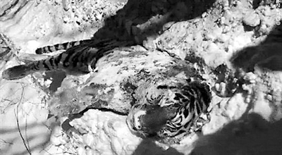 照片中,一只东北虎倒在雪地中,僵硬的尸体上覆盖着一层坚冰,脖颈处还能看到凝固的暗红的血迹,它头顶上黑褐色的“王”字斑纹,也随着它生命的逝去而失去了原有鲜明的形状。