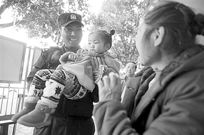 春运以来,成都铁路公安局西昌公安处抽调120名民警增援春运安保一线。图为2月4日,1名铁路特警帮助一名抱小孩的老人进站候车。 (王晓丹)