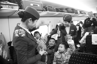 2月2日,在G1390次列车上,乘务员为小旅客们发放暖宝宝。