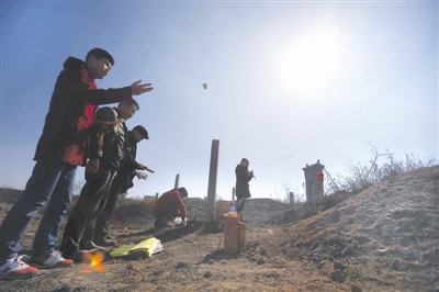 ②陕西凤翔,祭祖完毕的人们在坟前抛撒糖果。本报记者 杨登峰 摄
