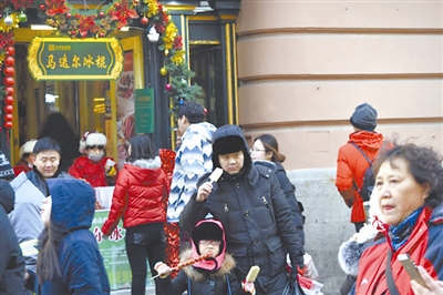 马迭尔冰棍是哈尔滨的一个特产。在这家老店门前,传统口味的冰棍被三根五根地买走,营业员告诉记者,每天卖出去三五百根不成问题。