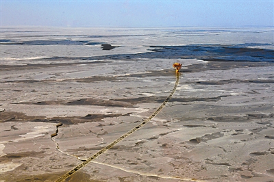 破冰船在千里冰封的渤海上啃出一条航道 。